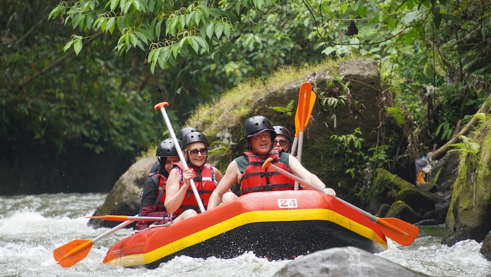The 14km of rapids are not too wild so most adults and children above 10 years are capable. If you need a rest any time your guide takes over the paddling. In our experience though once you get the adrenalin pumping the fun of rafting makes you forget any fatigue. The rafting in Bali adventure will be approx. 2 hours filled with twists, turns, bumps and splashes mixed in with humour from the guide.